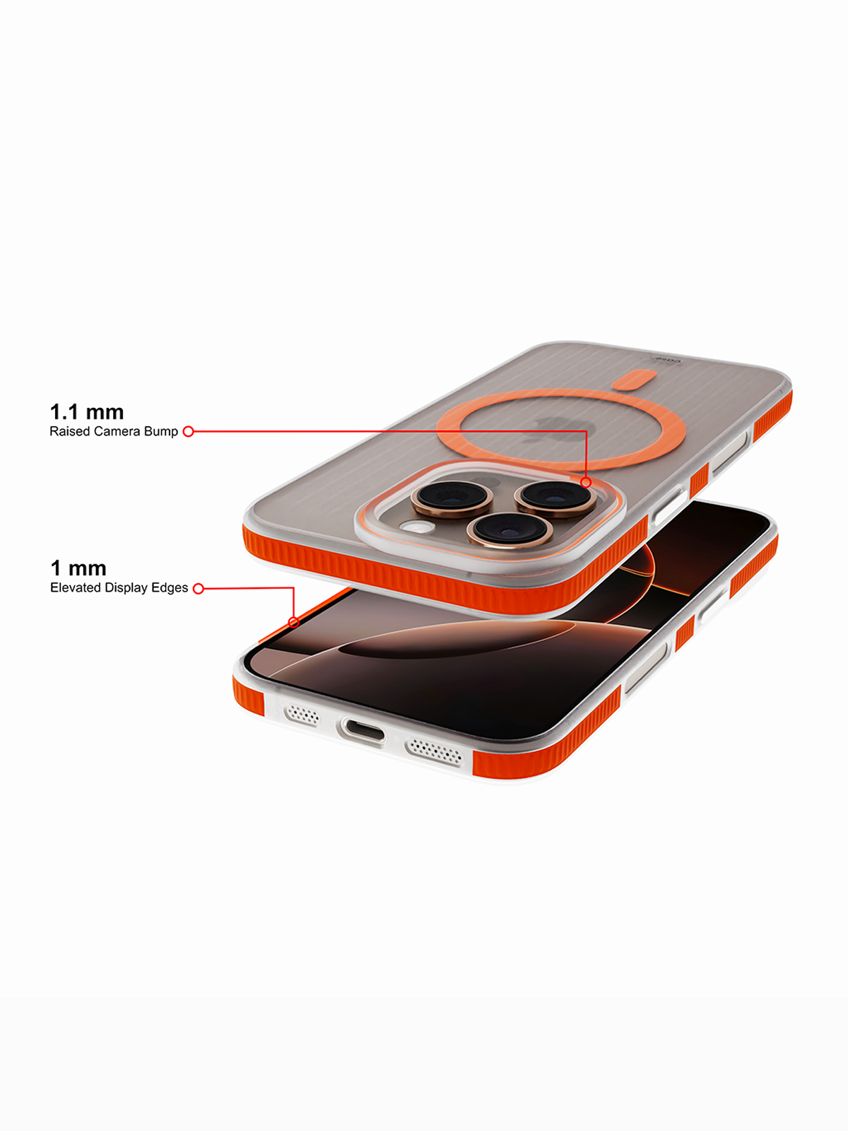 The Theta case offers comprehensive protection for your iPhone, safeguarding both your camera and screen. The 1.1 mm raised camera bump provides extra protection for your camera lenses during falls, while the 1 mm raised edges around the display create a barrier against scratches and impacts, ensuring your device remains safe and secure.